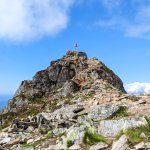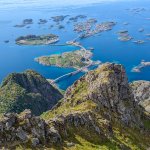 Skalnatý vrchol Festvågtindu s charakteristickou značkou na vrchole.