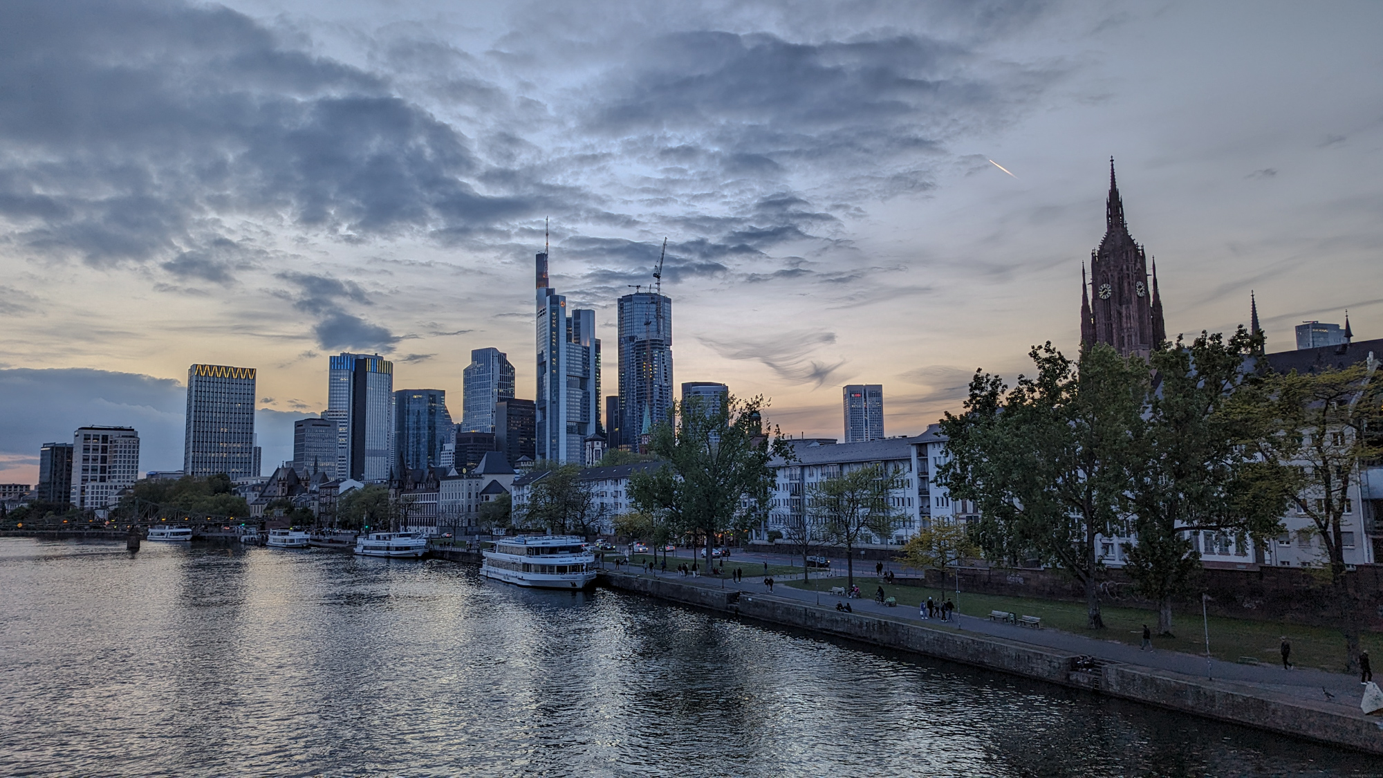 Foto 5: Večerný pohľad na centrum Frankfurtu nad Mohanom, fotený z mosta Eiserner Steg. (2024/04)